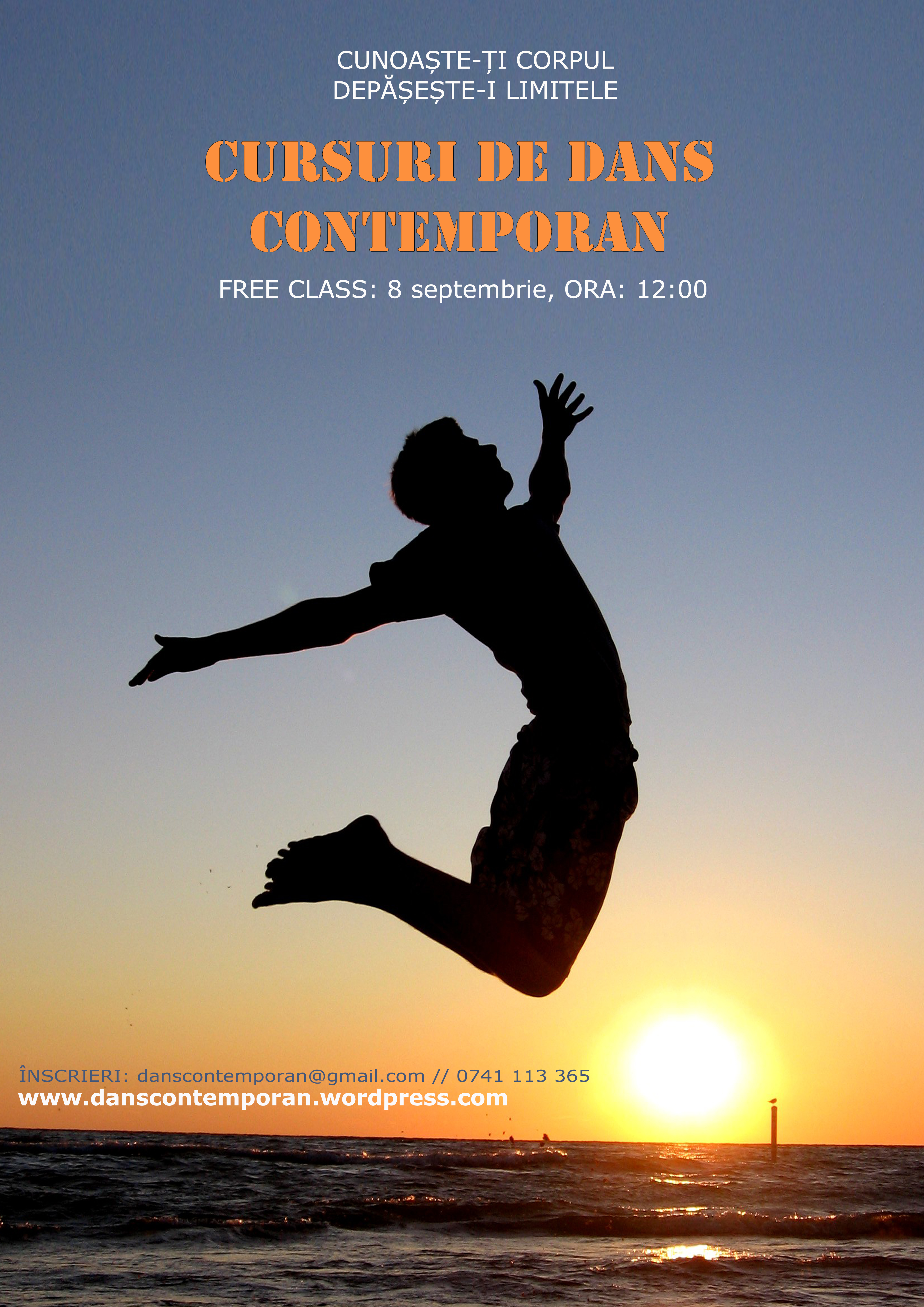 Din 9 septembrie CURSURILE DE DANS CONTEMPORAN revin in forta. In 2010 am dat startul la o serie de cursuri de dans contemporan, la care pana in prezent au participat peste 500 de iubitori de dans. Cu o structura occidentala, bazata pe imbinarea dintre tehnici de dans contemporan si dezvoltarea stilului personal prin exercitii de improvizatie, va asteaptam sa descoperim impreuna mecanismele care pun in miscare corpul. Am pregatit un concurs pentru voi! Castigati un abonament gratis daca postati o fotografie in saritura pe pagina de facebook http://www.facebook.com/danscontemporan.ro si acumulati cele mai multe like-uri. Pentru a va inscrie la cursuri trimiteti un mail pe adresa danscontemporan@gmail.com cu subiectul INSCRIERE sau sunati la 0741 113 365.