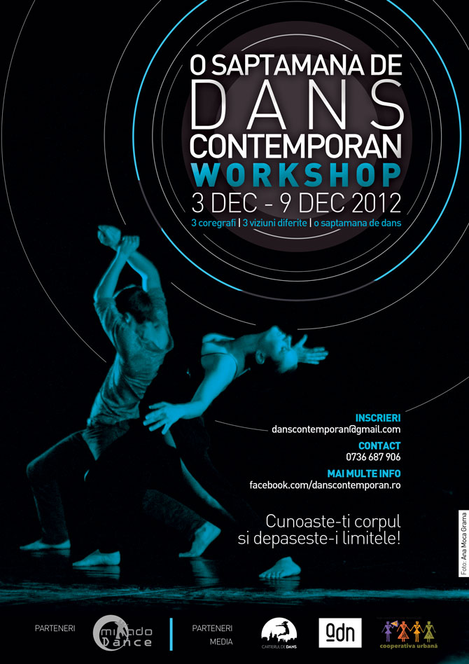 Dansul contemporan este unul dintre cele mai accesate stiluri de dans la ora actuala pentru ca este o forma lucida de exprimare libera si creativa.In 2011 workshop-ul nostru ‘’10 zile de dans contemporan” a generat un interes crescut printre pasionatii dansului, iar in acest an, revenim cu un nou workshop intensiv: “O saptamana de dans contemporan”. Se adreseaza celor care vor sa descopere si sa inteleaga mai bine dansul contemporan.In cele 7 zile consecutive vom dansa alaturi de 3 coregrafi: Vlad Merariu, Simona Deaconescu si Andreea Belu.In prima parte a fiecarui modul, accentul va fi pe constientizarea modurilor in care corpul nostru se manifesta in miscare in raport cu: spatiul, sunetul, muzica, ritmul, partenerii de dans si alti stimuli.In a doua parte fiecare coregraf va crea impreuna cu participantii cate un moment de coregrafie. Cele 3 momente de dans le vom prezenta invitatilor vostri duminica, intr-un curs deschis.Workshop-ul se va tine in perioada 3 – 9 Decembrie 2012, de luni pana vineri, de la orele 20:00-22:00, Sambata si Duminica de la 18:00-20:00. Structura pe module este urmatoarea: Luni si Marti: Simona Deaconescu